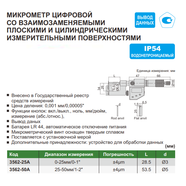 Микрометр универсальный МКУЦ-25 0,001мм IP65