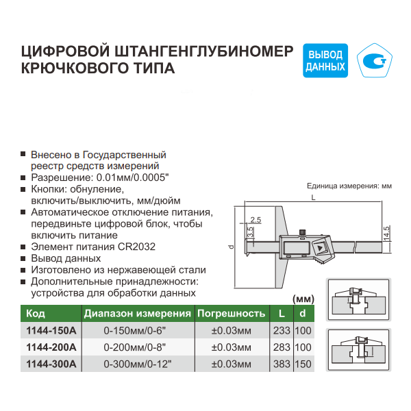 Штангенглубиномер крючкового типа ШГЦ-150 0,01мм