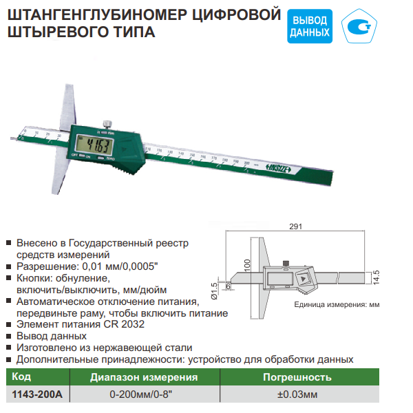 • Диапазон измерения 0-200мм/0-8"