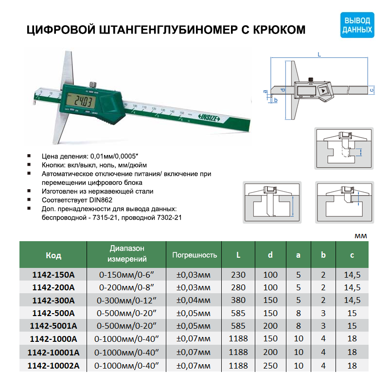 • Кнопки: вкл/выкл, ноль, мм/дюйм