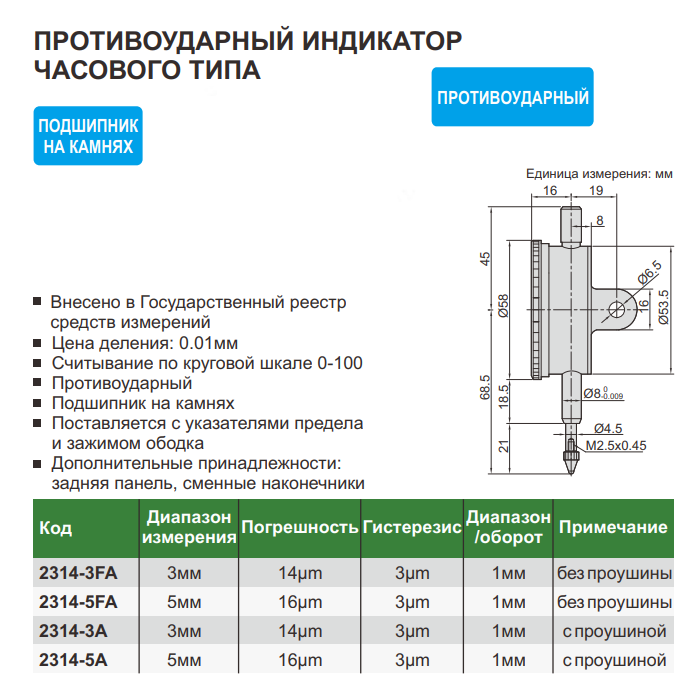 Индикатор противоударный ИЧ-3 0,01мм, подшипник на камнях, без ушка