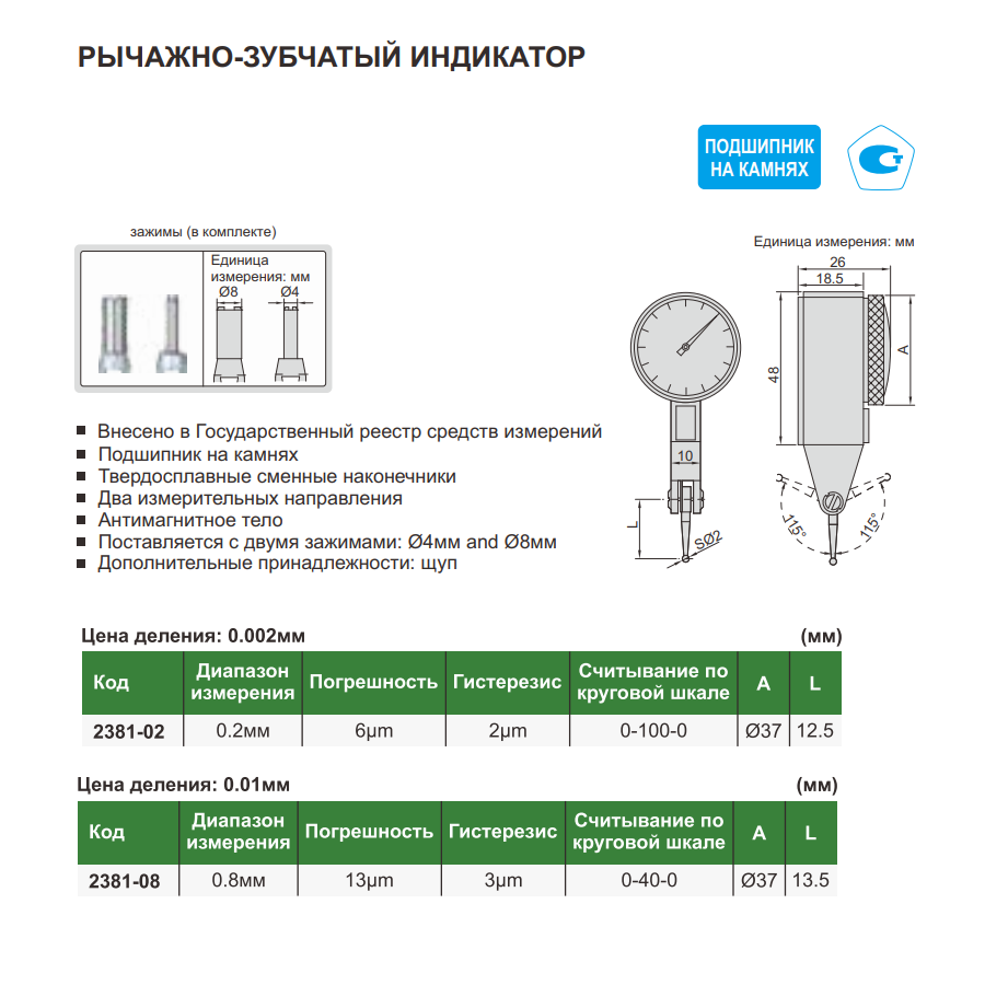 Индикатор ИРБ-0,2 0,002мм, подшипник на камнях