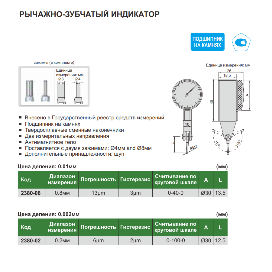 Индикатор ИРБ-0,8 0,01мм, подшипник на камнях
