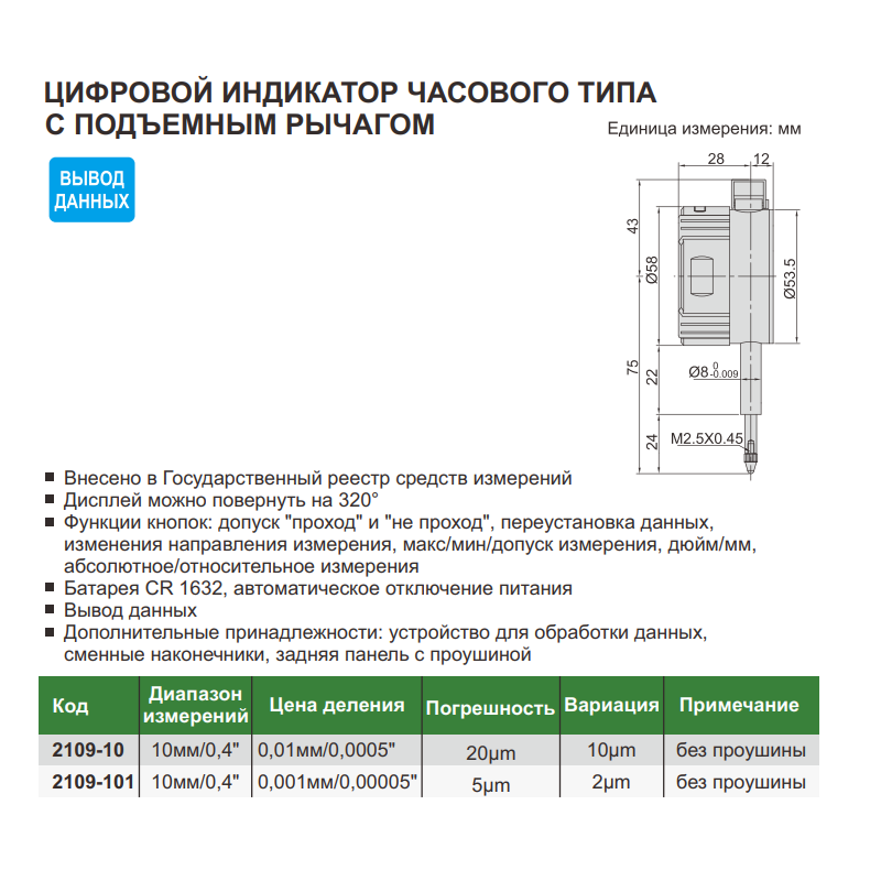 • Функции кнопок: допуск "проход" и "не проход", переустановка данных, изменения направления измерения, макс/мин/допуск измерения, мм/дюйм, абсолютное/относительно измерения