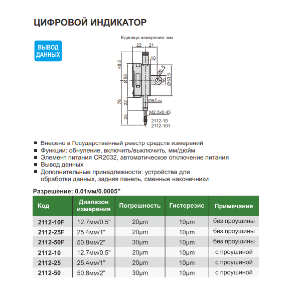 • Кнопки: вкл/выкл, обнуление, мм/дюйм,