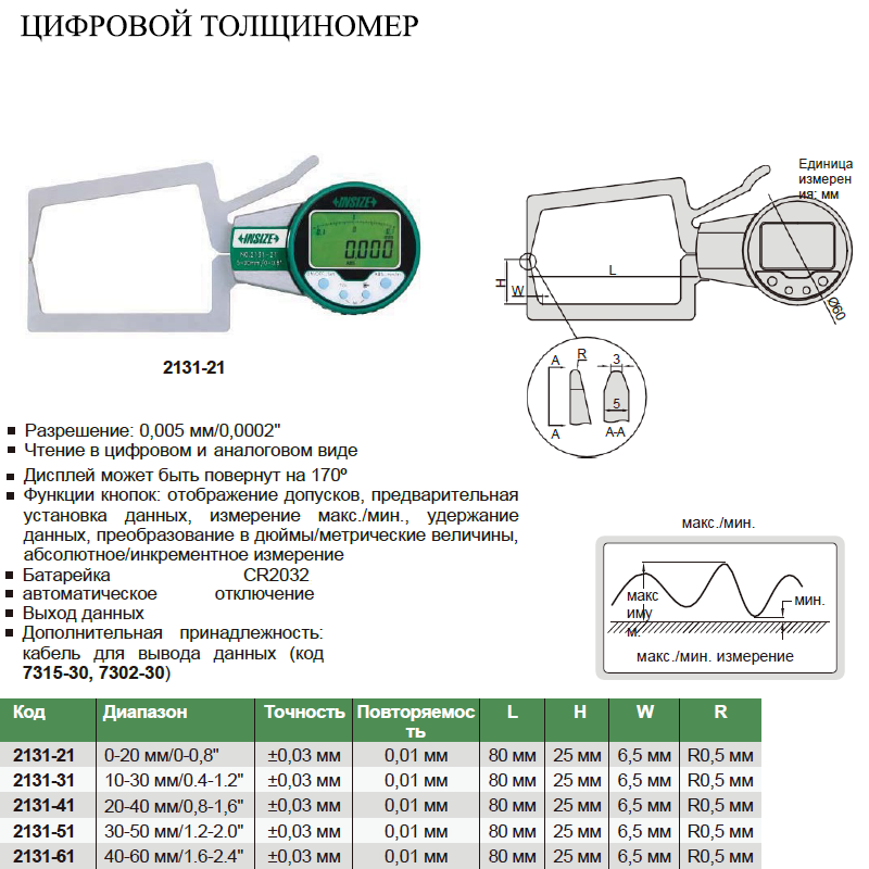 Функция кнопок: отоброжение допусков, предварительная установка данных, измерение макс/мик, удержание данных, преобразование в дюйм/метрические величины, абсолютное/относительное измерение.
