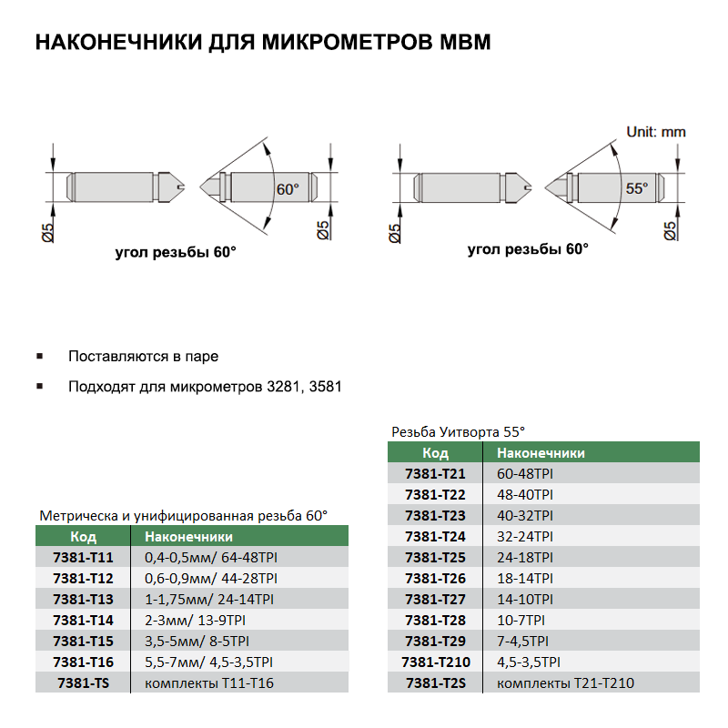 7381-T21 Наконечники для микрометров МВМ 60-48TPI 2 210руб.