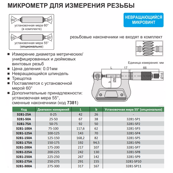 • Поставляется с установочной мерой 60° (кроме 0-25мм)