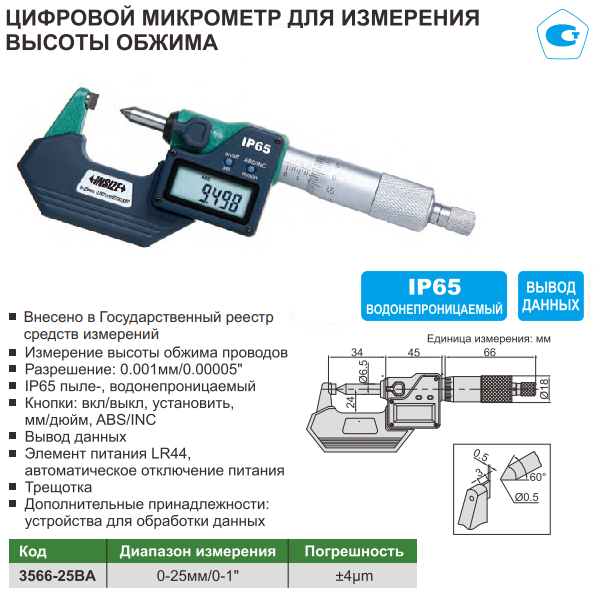 Микрометр цифровой д/изм. высоты обжима 25 0,001мм IP65