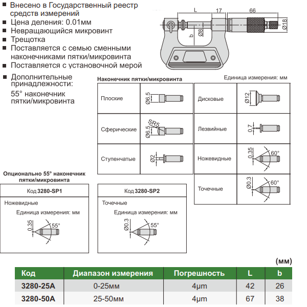 Микрометр универсальный МКУ-25-50-0,01мм с не вращающимся микровинтом 25-50 мм