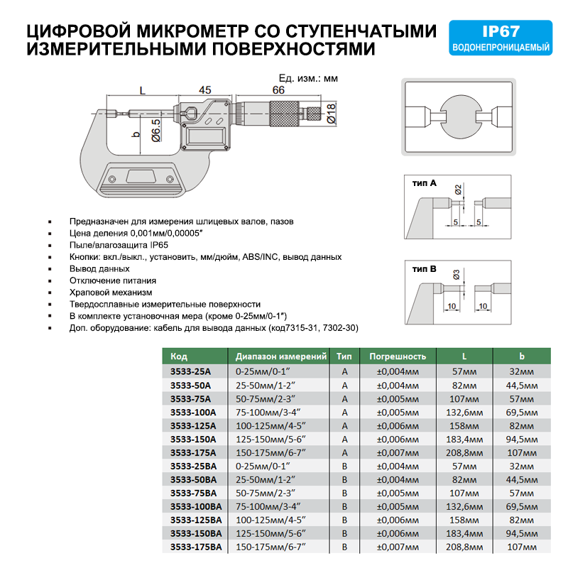 3533-50BA Цифровой микрометр со ступенчатыми измерительными поверхностями 50 0,001мм тип B IP65 35 030руб.