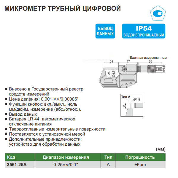 • Диапазон измерения: 0-25мм/0-1"