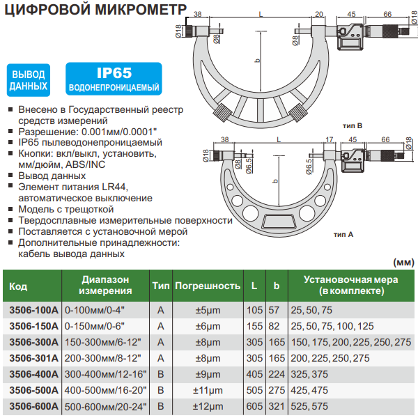 • Разрешение: 0,001мм/0,00005"