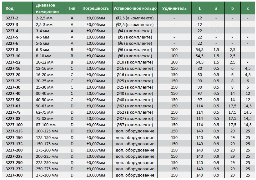 • Цена деления :    2-12 мм: 0,001 мм,    12-300 мм: 0,005 мм