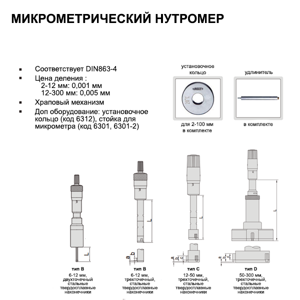 • Доп оборудование: установочное кольцо (код 6312), стойка для микрометра (код 6301, 6301-2)
