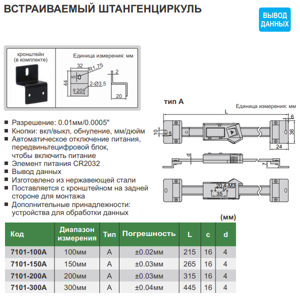 • Разрешение: 0.01мм/0.0005"