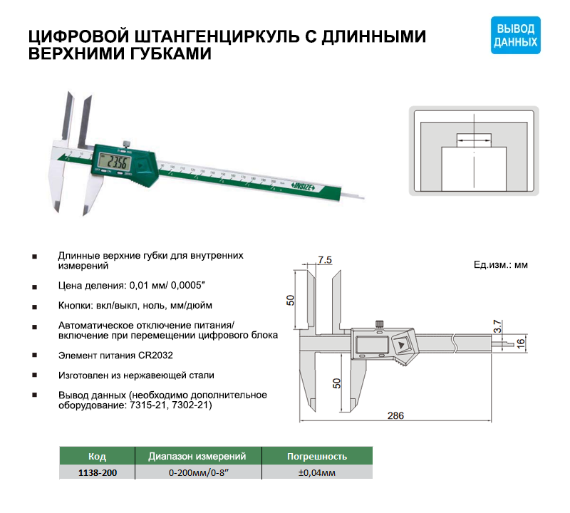 Штангенциркуль с длинными верхними губками ШЦЦ-1-200мм 0,01 мм