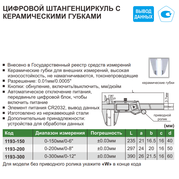 Штангенциркуль ШЦЦ-1-300 0,01 мм/0,0005" с керамическими губками