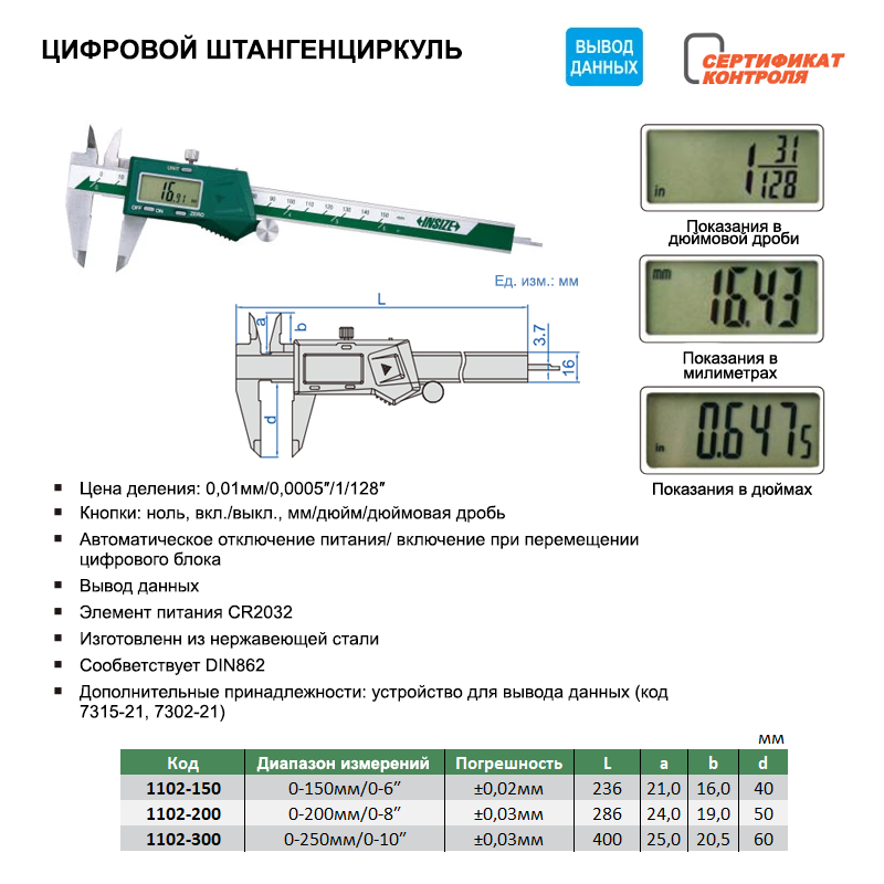 • Кнопки: ноль, вкл./выкл., мм/дюйм/дюймовая дробь