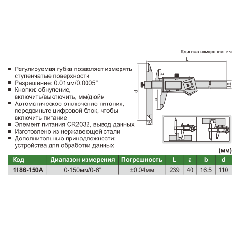 • Диапазон измерения 0-150мм/0-6