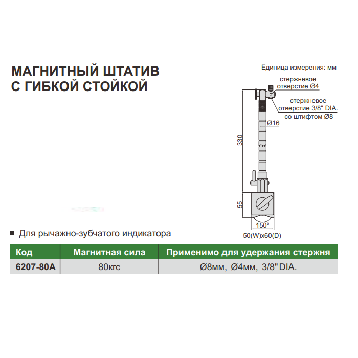 Магнитная стойка-330мм 80кгс, D-4мм, 8мм, 3,8" DIA