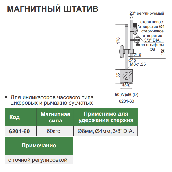 Магнитный штатив-176 60кгс, D- 4мм, 8мм, 3,8" DIA с точной регулировкой