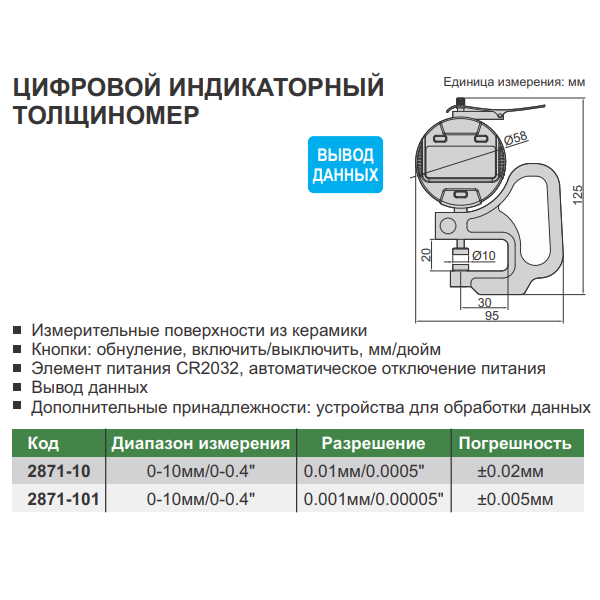 • Кнопки: обнуление, включить/выключить, мм/дюйм