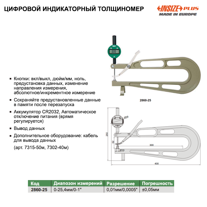 Кнопки: вкл/выкл, дюйм/мм, ноль, предустановка данных, изменение направления измерения, абсолютное/инкрементное измерение